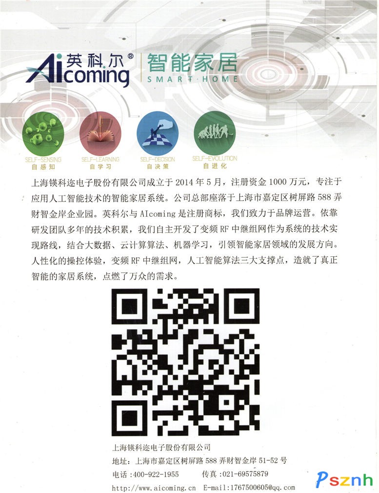 上海锳科邇電子股份有限公司成立于2014年5月,注冊資金1000萬元,專注于應用人工智能技術的智能家居系統。公司總部座落于上海市嘉定區樹屏路588弄財智金岸企業園。