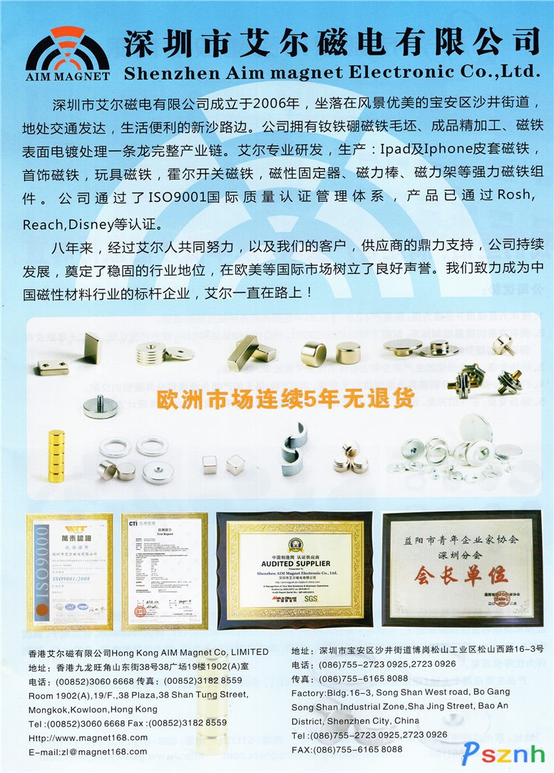 艾爾磁電產(chǎn)品主要應(yīng)用于高端數(shù)碼電子產(chǎn)品,高端皮具,智能家居,汽車配件等行業(yè)。2009年通過ISO9001國際質(zhì)量管理體系認證,2014年通過SEDEX社會責任體系認證,產(chǎn)品通過Rosh,Reach等環(huán)保檢測。公司歷經(jīng)10年穩(wěn)定發(fā)展,培養(yǎng)了強大的技術(shù)和服務(wù)團隊,擁有釹鐵硼強力磁鐵生產(chǎn)加工、表面電鍍處理一條龍產(chǎn)業(yè)鏈,已在業(yè)界樹立了良好的口碑,各種磁鐵和磁性材料制品已暢銷國,內(nèi)外。艾爾磁電將持續(xù)創(chuàng)造一個與員工,客戶,廠商共贏格局,致力成為磁性材料制品行業(yè)的標桿企業(yè)。