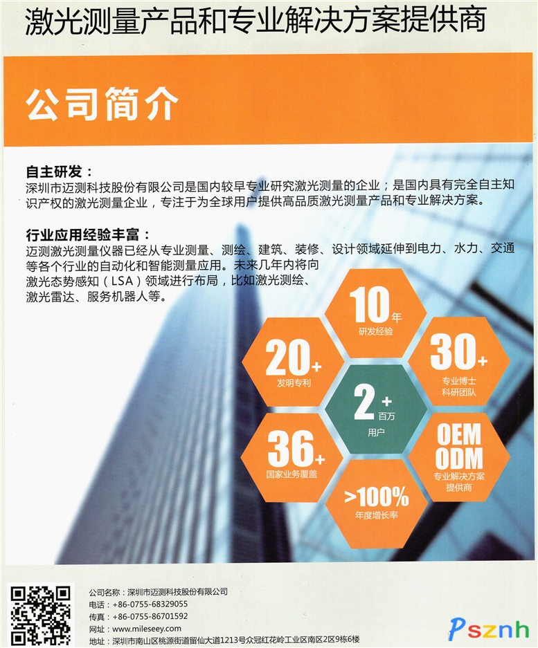 深圳市邁測科技股份有限公司是國內較早研究和生產(chǎn)高精度手持測距儀的廠家之一,具有超過16年的行業(yè)積累,是國內較早進入測量領域的一批企業(yè),目前出口銷量排行全國前三甲,已經(jīng)成為行業(yè)的先鋒部隊。合理的法人治理結構將公司的管理層和技術精英緊密地連接在一起,形成了一個強有力的工作團隊。公司結合自身的特點,不斷汲取有效的運作模式和科學的管理方法,加強企業(yè)內部管理,逐步建立起現(xiàn)代化的管理機制,完善了組織機構運營體系,為客戶提供高效的服務,實現(xiàn)公司的全面發(fā)展。
