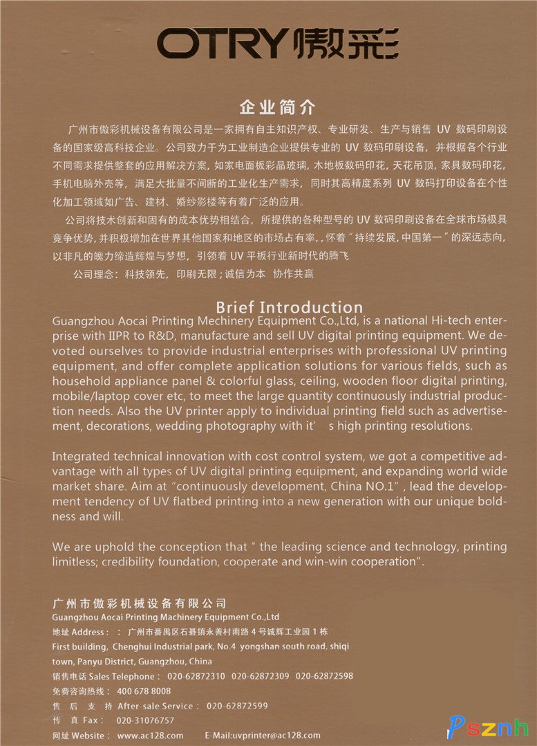“真誠互溝通、服務無止境”的服務精神,把最好的UV打印機、高效的萬能平板打印機、可持續發展的印刷設備和方案提供給廣大客戶。一個正在崛起的企業,一個不斷開拓的企業,懷著“持續發展,中國第一”的深遠志向,以非凡的魄力締造輝煌與夢想,引領著UV平板行業新時代的騰飛。