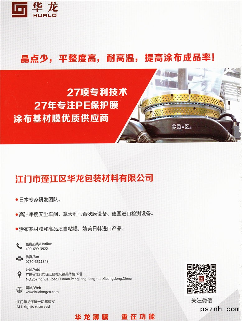 近30年來,江門華龍一直專注于研發、制造高品質薄膜,主要包括多層共擠PE復合膜、微晶點PE保護膜及各種功能性PE薄膜。年產量達42000噸,在品質、規模上均位居行業前列,深受國內外客戶信任。