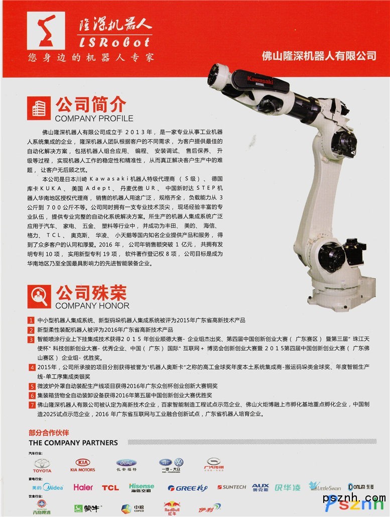 佛山隆深機器人有限公司成立于2013年,位于佛山市順德區北滘鎮三樂東路25號順德創新產業園內,注冊資本520萬元,公司占地面積約3000平米,是一家專業從事工業機器人系統集成的企業。企業先后被認定為2015年第一批高新技術培育入庫企業、廣東省機器人骨干(培育)企業、順德區百家企業智能制造工程第五批試點示范企業、佛山火炬博融上市孵化基地重點孵化企業、2016年廣東省互聯網與工業融合創新試點企業、“中國制造2025”第二批試點示范創建企業等榮譽。