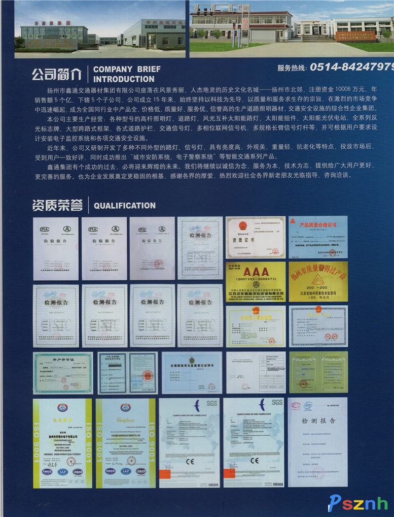 公司已通過(guò)IS09001質(zhì)量管理、IS014001環(huán)境管理、GB/T28001職業(yè)健康安全管理、CCC和CQC等管理體系認(rèn)證。已取得道路照明工程二級(jí)、交通信號(hào)燈、信號(hào)控制機(jī)等多項(xiàng)資質(zhì)證書(shū),并獲得“AAA級(jí)資信企業(yè)”、“重合同守信用企業(yè)”、“江蘇省名牌產(chǎn)品”等榮譽(yù)稱(chēng)號(hào)。
