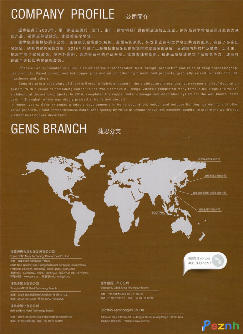 公司銅裝飾產品覆蓋金屬落水、建筑屋面、銅燈、家居、園藝、銅藝等領域。其中,金屬落水系統與多家工程案例合作,取得了不菲的成績,2016年上海迪斯尼項目的落成對于捷思的發展具有里程碑式的意義。室外銅裝飾包括銅尖頂、煙囪冒、通氣帽、銅瓦片以及風向標等銅質屋面裝飾系統。銅燈款式多樣、設計精美,包括吊燈、臺燈、壁燈、柱頭燈等品類。而新近研發的園藝:銅花盆、銅鳥屋和園藝工具設計新穎獨特,備受市場青睞。