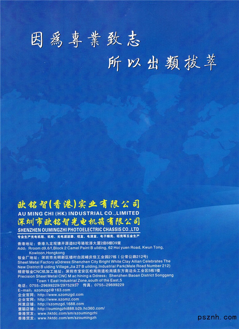 深圳市歐銘智光電機箱有限公司, 中國總廠機箱,機柜,CNC電腦鑼加工,CNC數控車床,自動車床加工:深圳市歐銘智光電機箱有限公司, 是深圳市中型的金屬成型專業廠家合資企業,有很強的產品設計、模具設計及制造加工能力。全面強化質量管理,從產品設計、原材料采購、生產加工到品質測試的各個環節都處于全面受控狀態,確保產品的優良品質。專業生產光電機箱,機柜,光電濾波器,、鋁盒,電源盒,電子煙殼,鋁殼等五金生產、及加工,國內貿易,貨物及技術進出口、配件等產品專業生產加工的公司,擁有完整、科學的質量管理體系。