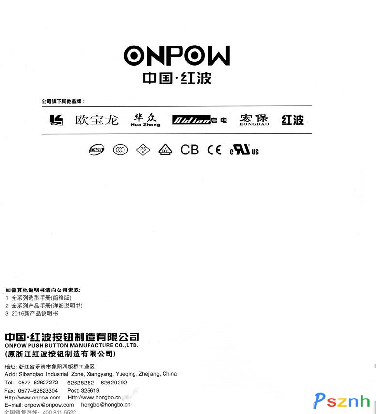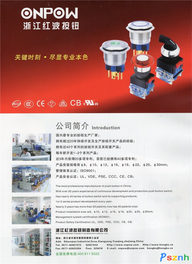 紅波按鈕制造有限公司于2012年由浙江紅波按鈕制造有限公司升級為中國·紅波按鈕制造有限公司,成為全國無區域公司,感恩所有客戶的關注,由于市場上仿冒產品較多,請認準“ONPOW”商標,使用其他商標的產品均不屬于本公司產品,所有不以中國·紅波按鈕宣傳銷售的產品均不屬于我公司產品。