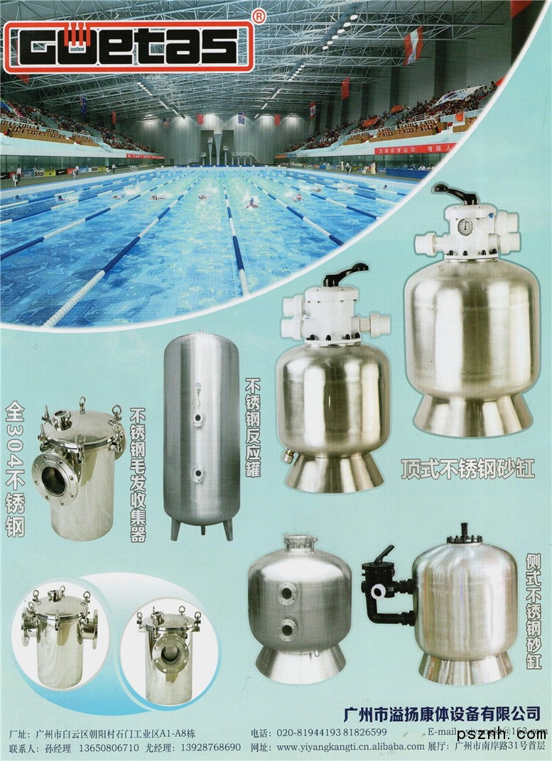 廣州市溢揚康體設備有限公司是一家集生產銷售,桑拿、泳池、水療設備,噴泉設備于一體的企業,主要生產的產品有、不銹鋼沙缸、不銹鋼毛發過濾器、MF-80\MF-260\MF-400換熱器、泳池扶梯扶手;游泳池不銹鋼掛燈、塑料掛壁燈、噴泉燈、泳池預埋燈;膠膜池主排、膠膜噴嘴、膠膜池燈具、水療噴頭等。另代理批發各大知名品牌的泳池過濾、循環、加熱設備。公司門市位于中國廣東廣州市荔灣區廣州市荔灣區31號。廣州市溢揚康體設備有限公司本著“客戶第一,誠信至上”的原則,與多家企業建立了長期的合作關系。熱誠歡迎各界朋友前來參觀、考察、洽談業務。