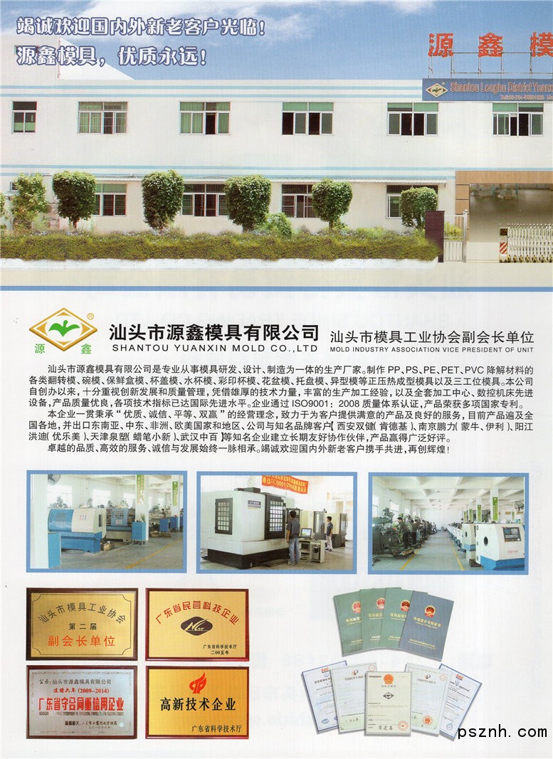 汕頭市源鑫模具有限公司是專業從事模具研發、設計、制造為一體的生產廠家。制作PP、PS、PE、PET、PVC降解材料的各類翻轉模、碗模、保鮮盒模、杯蓋模、水杯模、彩印杯模、花盆模、托盤模、異型模等正壓熱成型模具以及三工位模具。本公司自創辦以來,十分重視創新發展和質量管理,憑借專業、專注、專攻的技術力量,豐富的生產加工經驗,以及加工中心、數控機床先進設備,產品質量優良。榮獲多項國家專利,專利號分別為ZL 2008 2 0206796.6/ZL 2008 2 0206798.5/ZL 2012 2 0394227.5/ZL 2012 2 0429973.3/ZL 2012 2 0394111.1/ZL 2013 1 0049526.4/ZL 2014 2 0493748.5/ZL 2015 2 0803914.1/ZL 2015 2 0828264.6。