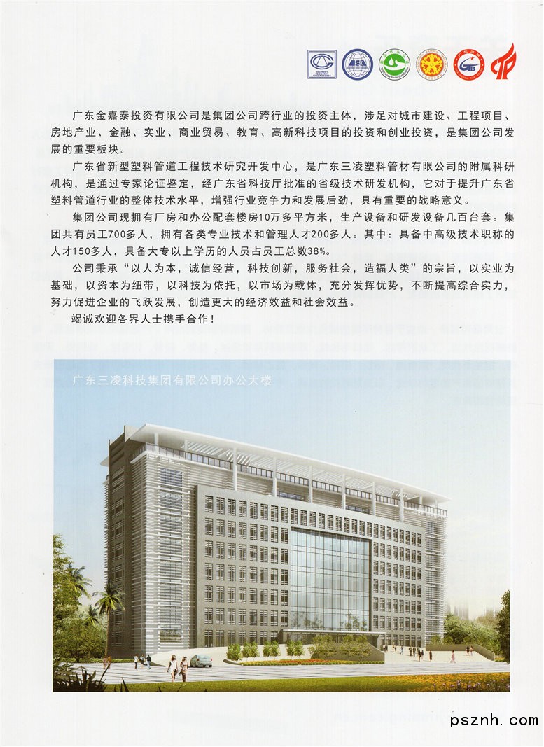 廣東省金嘉泰投資有限公司是集團公司發展的重要板塊,涉足城市建設、工程項目、房地產業、實業、商業貿易、教育、高新科技的項目投資和創業投資等領域。廣東省工程技術研究開發中心是通過專家論證鑒定,經廣東省科技廳、發改委和經信委聯合批準,以三凌塑料管材公司為依托的省級技術研發機構。它對于提升塑料管道行業的整體技術水平,增強行業競爭力和發展后勁,具有重要的戰略意義。研發中心主要是通過對新型塑料管道工程技術的深入研究,創新改性復合材料在塑料管道領域的技術,研究開發各類新產品、新材料,形成具有自主知識產權的核心技術,為同行業提供技術示范、技術咨詢和技術服務,促進研發成果產業化。