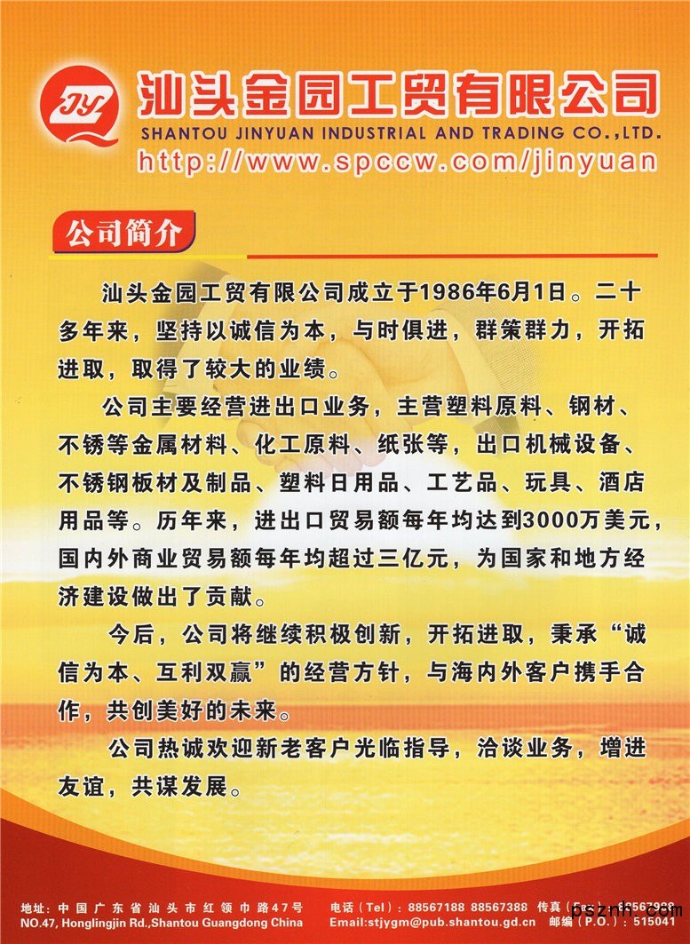 汕頭金園工貿(mào)有限公司主要經(jīng)營進(jìn)出口業(yè)務(wù)、國內(nèi)外貿(mào)易。主營塑料原料、化工原料、金屬材料、紙張,出口機(jī)械設(shè)備、不銹鋼板材及制品、塑料日用品、工藝品、金屬制品、酒店用品、服裝等。在國內(nèi)外貿(mào)易業(yè)務(wù)中,公司恪守信用,廣交朋友,與國內(nèi)外客戶建立了良好的合作關(guān)系,樹立了較高的聲譽(yù),進(jìn)出口貿(mào)易每年均超過2000萬美元,國內(nèi)商業(yè)貿(mào)易額每年均超過一億元。 經(jīng)過二十多年的創(chuàng)業(yè)、開拓與發(fā)展,公司建成一批工業(yè)廠房及設(shè)施,形成規(guī)模化的工業(yè)生產(chǎn)、出口貿(mào)易基地,擁有較強(qiáng)的經(jīng)濟(jì)實(shí)力。今后,公司將積極創(chuàng)新,開拓進(jìn)取,秉承“誠信為本、互利雙贏”的經(jīng)營方針,與海內(nèi)外客戶攜手合作,共創(chuàng)美好的未來。