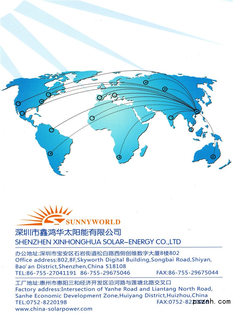 公司成立于2003年, 是國(guó)內(nèi)成立較早的光伏組件生產(chǎn)商,也是獲得深圳市政府認(rèn)可的高新技術(shù)企業(yè)。公司一直致力于太陽(yáng)能組件的研發(fā),制造及銷售。我們的產(chǎn)品覆蓋了3W至340W的單晶/多晶硅太陽(yáng)能組件,40W至200W的可折疊組件, 10W至300W的柔性組件。同時(shí)可根據(jù)客戶要求定制各種特殊規(guī)格的組件。