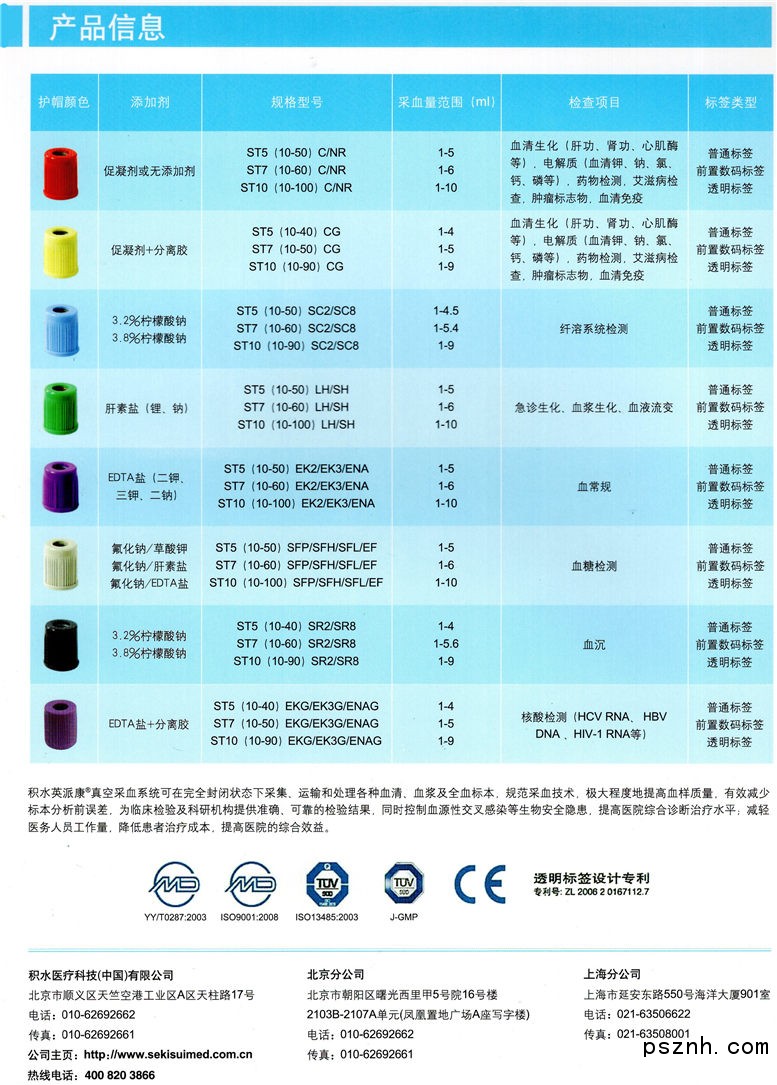 北京積水創格醫療科技有限公司是由日本積水化學工業株式會社與國內上市企業中青旅控股股份有限公司于2003年共同組建的合資公司,公司注冊資本1200萬美元,總投資2900萬美元。積水化學工業株式會社從1985年即開始生產PET真空采血管,是世界上最早生產塑料真空采血管的廠家,具有獨自尖端的生產技術,特別是PET原管制造裝置、血清分離劑填充裝置、藥劑分注裝置等是積水化學經過多年研究開發的高度專業化的精密儀器。積水創格生產的英派康(INSEPACK)真空采血系統,所用制劑和分離膠等的所有原材料均由積水化學工業株式會社自主開發研制。強大的技術實力為英派康(INSEPACK)真空采血產品走向世界、服務醫療奠定了堅實的基礎。2010年2月,“北京積水創格醫療科技有限公司”獨資化,成為積水化學工業株式會社完全投資的“積水醫療科技(中國)有限公司”。