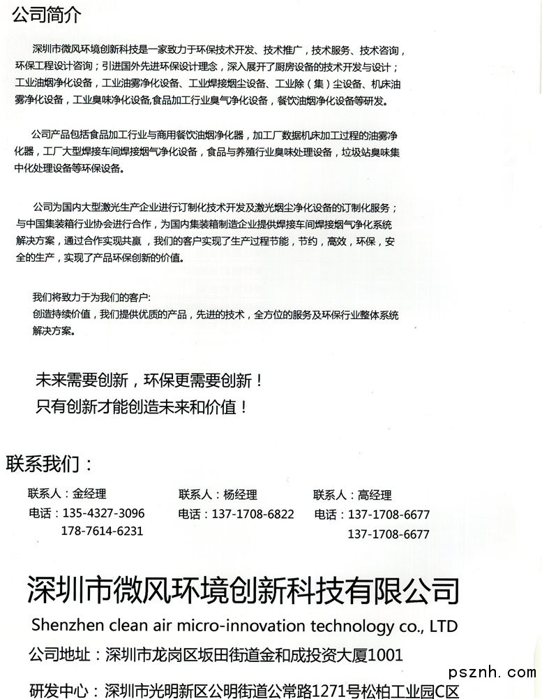公司產品包括食品加工行業與商用餐飲油煙凈化器,加工廠數據機床加工過程的油霧凈化器,工廠大型焊接車間焊接煙氣凈化設備,食品與養殖行業臭味處理設備,垃圾站臭味集中化處理設備等環保設備。