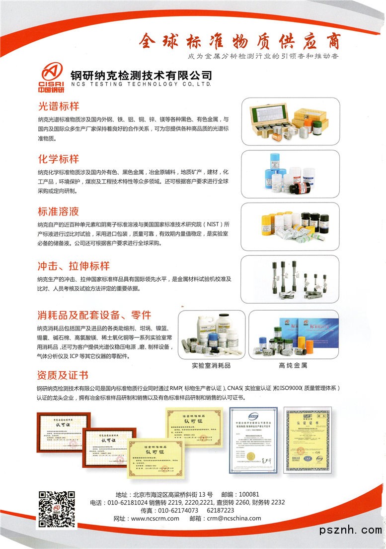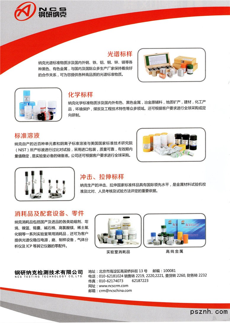 鋼研納克檢測技術(shù)股份有限公司是依托于鋼鐵研究總院分析測試所的技術(shù)優(yōu)勢,專業(yè)研制、銷售標(biāo)準(zhǔn)物質(zhì)產(chǎn)品。是中國冶金、有色金屬標(biāo)準(zhǔn)樣品授權(quán)研制與銷售單位。從1952年起研制400余種標(biāo)準(zhǔn)物質(zhì),經(jīng)過幾十余年的努力,建立了較為完善的中國冶金標(biāo)準(zhǔn)物質(zhì)體系,同時代銷國內(nèi)其他的標(biāo)準(zhǔn)物質(zhì)生產(chǎn)者提供的產(chǎn)品。