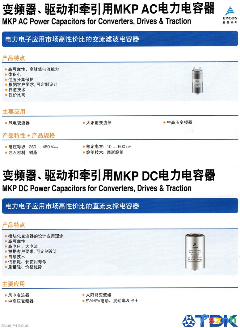 電容器應用于電工及電子的所有領域,用于存儲電荷并提供電流和電壓濾波功能。愛普科斯 (EPCOS) 電容器產品組合包括鋁電解和薄膜電容器,主要應用于電源和逆變器。電力電容器在諸多應用場合均發揮關鍵作用,不僅可確保電動火車等的可靠供電,還是高壓直流電輸送的關鍵元件,確保電能的長距離輸送且損耗最小。