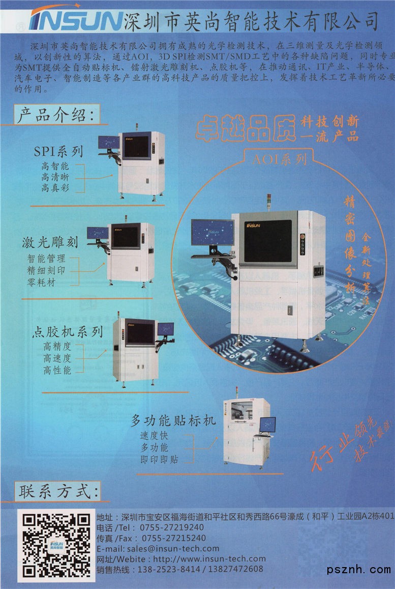 深圳市英尚智能技術有限公司擁有成熟的光學檢測技術,在三維測量及光學檢測領域,以創新性的算法,通過AOI,3D SPI檢測SMT/SMD工藝中的各種缺陷問題,同時專業為SMT提供全自動貼標機、鐳射激光雕刻機、點膠機等,在推動通訊、IT產業、半導體、汽車電子、智能制造等各產業群的高科技產品的質量把控上,發揮著技術工