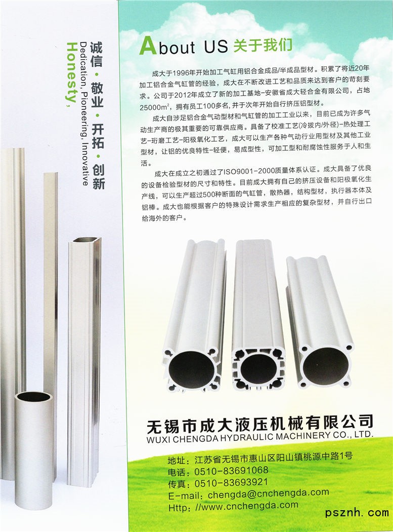 | 于1996年開始加工氣缸用鋁合金成品/半成品型材。積累了將近20年加工鋁合金氣缸管的經(jīng)營,成大在不斷改進(jìn)工藝和品質(zhì)來達(dá)到客戶的苛刻要求。公司于2012年成立了新的加工基地-安徽省成大輕合金有限公司,占地25000平方米,擁有員工100多名,并于次年開始自行擠壓鋁型材。 成大自涉足鋁合金氣動(dòng)型材和其鋼管的加工工業(yè)以來,目前已成為許多氣動(dòng)生產(chǎn)商的及其重要的可靠供應(yīng)商。具備了校準(zhǔn)工藝(冷拔內(nèi)、外徑)-熱處理工藝-珩磨工藝-陽極氧化工藝,成大可以生產(chǎn)各種氣動(dòng)行業(yè)用型材及其他工業(yè)型材,讓鋁的優(yōu)良特性-輕便,易成型性,可加工型和耐磨腐蝕性服務(wù)于人和生活。 成大成立之初通過了ISO9001-2000質(zhì)量體系認(rèn)證。成大具備了優(yōu)良的設(shè)備檢驗(yàn)型材的尺寸和特性。目前成大擁有自己的擠壓設(shè)備和陽極氧化生產(chǎn)線,可以生產(chǎn)超過500中斷面的氣缸管,散熱器,結(jié)構(gòu)型材,執(zhí)行器本體及鋁棒。成大也能根據(jù)客戶的特殊設(shè)計(jì)需求生產(chǎn)相應(yīng)的復(fù)雜型材,并自行出口給海外的客戶。 |