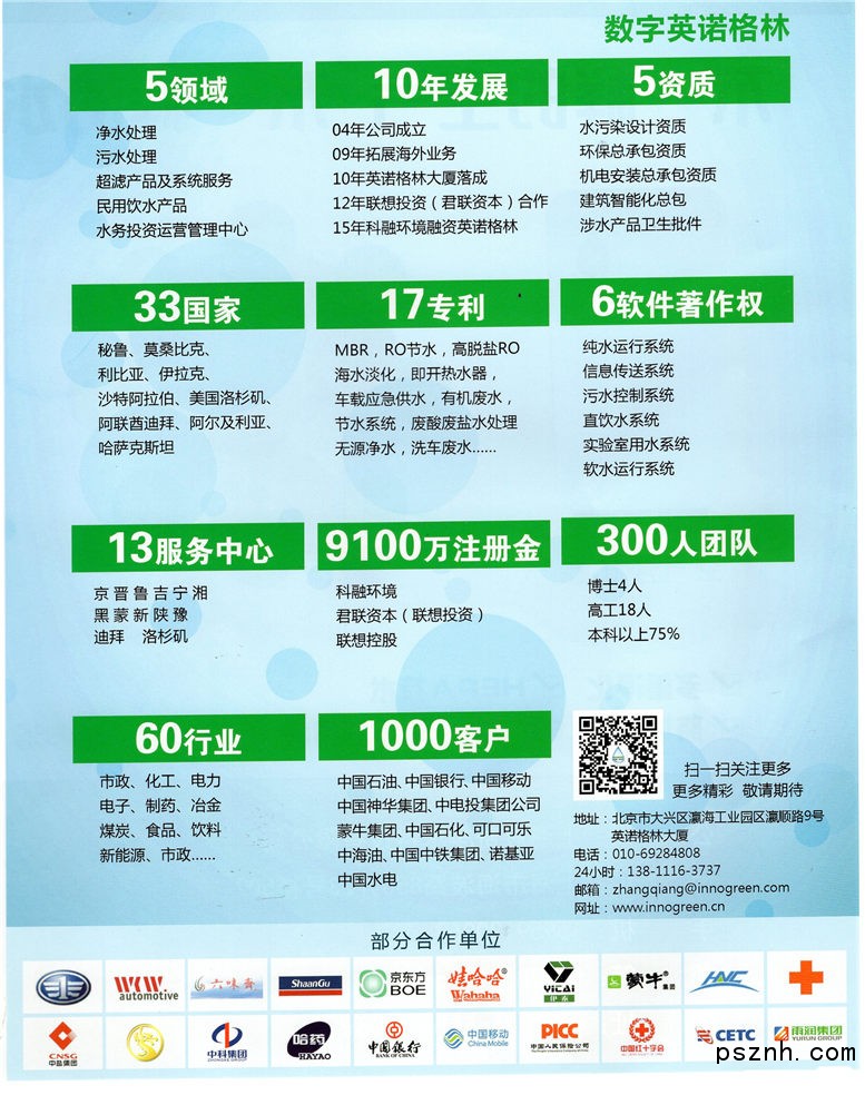公司注冊資本9100萬元,公司擁有17項水處理相關國家專利,300余名專業水處理人才,在北京15000平米現代化廠房和在徐州經濟開發區占地545畝生產基地,廠房面積67000㎡。英諾格林在市政、化工、電力、電子、制藥、冶金、煤炭、食品飲料、中水回用、垃圾滲濾液、海水淡化等不同領域水處理技術上均取得了重大突破,并服務了眾多知名客戶。在膜材料制備、膜組件制造和膜系統應用方面,英諾格林整合國內一流專家、技術和設備,相關膜產品已經達到國內領先國際先進的水平。公司獨創的IMWS(innogreen modular watertreatment system英諾格林模塊化水處理系統)技術,掀起了水處理領域的革命,通過眾多項目積累的模塊化設備的經驗,確保了每個系統的可靠性、穩定性和易用性,引領了未來水處理行業的發展。