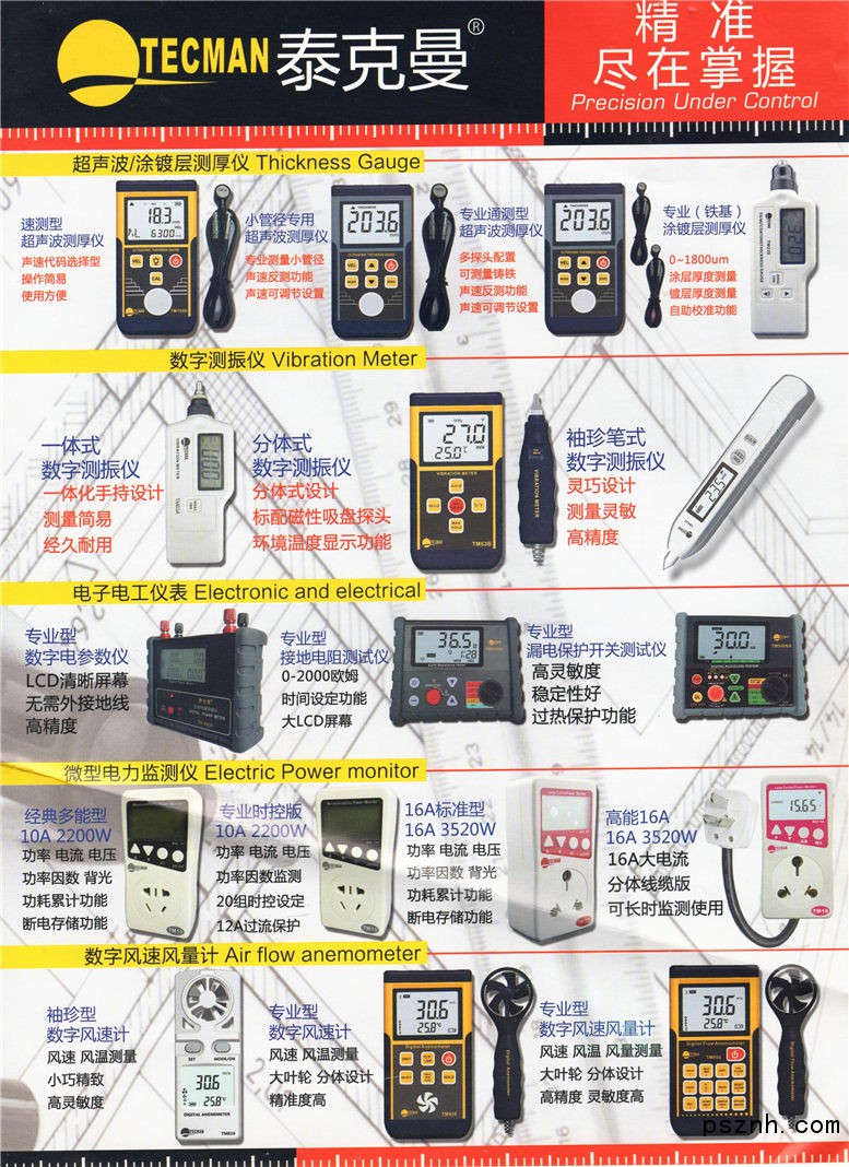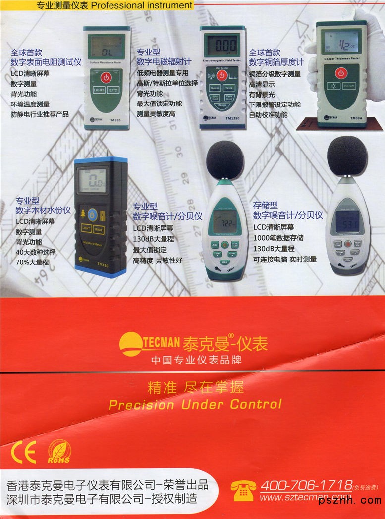 泰克曼電子儀器(香港)控股有限公司深圳市泰克曼電子有限公司公司簡介: 香港泰克曼電子儀器控股有限公司(TECMAN ELECTRonIC INSTRUMENT HOLDINGS LIMITED)專業(yè)研發(fā)及制造TECMAN(泰克曼)品牌系列各類專業(yè)儀器儀表,公司產(chǎn)品包含:便攜式非接觸紅外測溫儀、數(shù)字式測振儀、超聲波測厚儀、涂層測厚儀、數(shù)字風速風量計、數(shù)字噪音計、數(shù)字式溫濕度計、人體測溫儀等專業(yè)儀表;對國內(nèi)外行業(yè)特殊需求客戶提供OEM及ODM相關(guān)服務(wù)。 本公司秉持:品質(zhì)創(chuàng)造價值;科技 服務(wù)于人的企業(yè)發(fā)展理念,堅持不懈的為國內(nèi)外客戶提供性能穩(wěn)定,品質(zhì)優(yōu)良的產(chǎn)品。 TECMAN品牌在國內(nèi)外市場的建設(shè)和推廣是本公司堅定不移的目標,為客戶提供品質(zhì)優(yōu)良的產(chǎn)品和快捷無憂的售后服務(wù)是本公司信守的諾言。 本公司熱忱歡迎國內(nèi)外有實力的客戶共同開發(fā),協(xié)作發(fā)展,開創(chuàng)TECMAN美好的未來。 香港泰克曼電子儀器控股有限公司 TECMAN ELECTRonIC INSTRUMENT HOLDINGS LIMITED