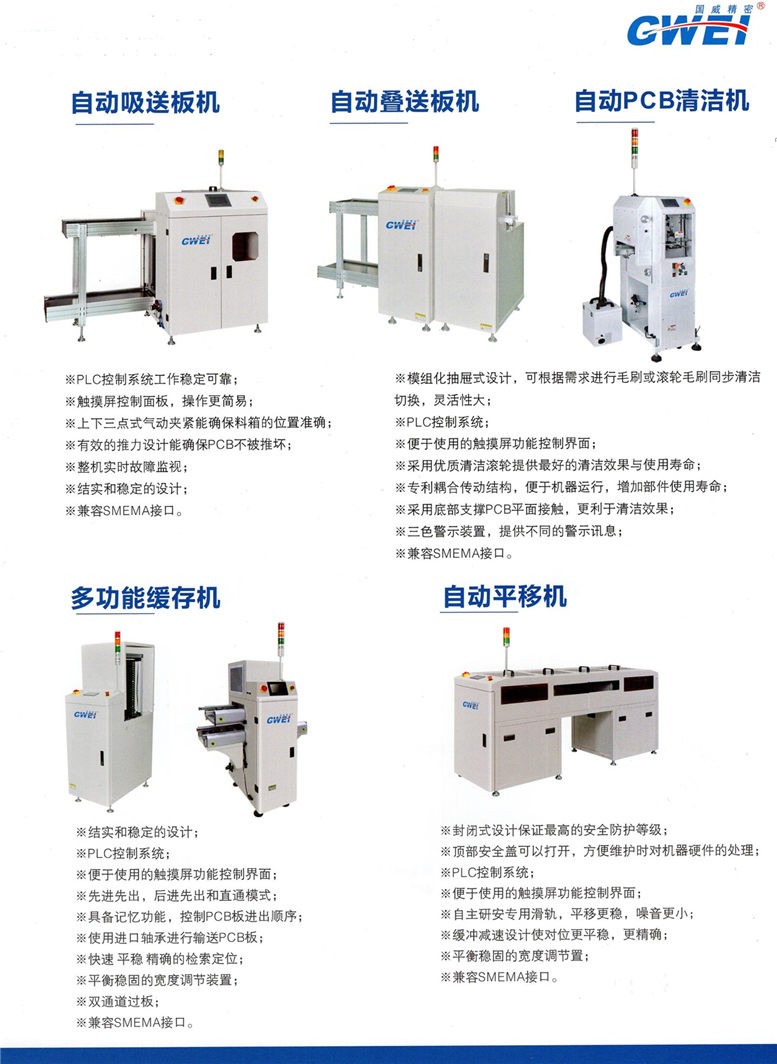 深圳市國威精密設備有限公司是一家專業從事SMT輸送連接設備的集規劃、設計、研發、生產與銷售于一體的專業生產廠商。經過不斷的推陳出新,公司積極進取,不斷完善,針對客戶的需求,我公司推出了標準型、高檔型全系列的上/下板機,接駁臺等相關設備。“客戶滿意,科技創新,持續改善,品質至上。”是我們公司的永久經營目標。為滿足客戶的需求,我們的研發人員經常直接到客戶設備使用現場,了解設備的異常情況,尋求最佳的解決方案,不斷推出更新、完善的產品。