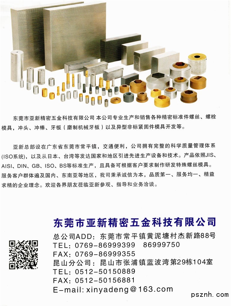 東莞市亞新精密五金科技有限公司是專業(yè)生產(chǎn)、銷售十字沖模,高強度機絲牙板及各類螺絲模具的廠家.能滿足JIS,ANSI,BS,GB DIN之標(biāo)準(zhǔn).十字沖頭用M42高速鋼及牙板用DC53材料.工廠全線引進進口設(shè)備精工制造.并從日本,臺灣高薪聘請一批螺絲模具界高級工程師作技術(shù)顧問及現(xiàn)場指導(dǎo).具有成熟之生產(chǎn)工藝,先進的加工技術(shù),完備之檢測手段,擁有雄厚之開發(fā)'能力和專業(yè)的服務(wù)隊伍.經(jīng)過二年的模索我司終于掌握了TD表面處理之技術(shù)工藝在十字精沖上的應(yīng)用,為螺絲制造業(yè)提供高質(zhì)量,高壽命之模具和高素質(zhì)之服務(wù).