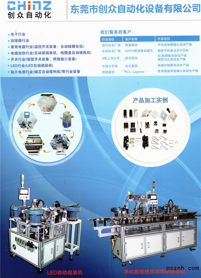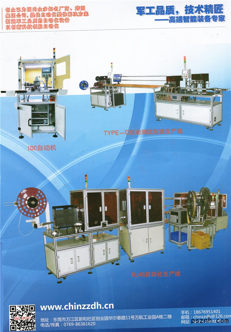 東莞市創眾自動化設備有限公司始創于2007年,具有多年的自動化設備行業經驗,是行業領先的專業非標自動化設備制造商之一;創眾致力于為客戶提供全面的自動化設備解決方案;公司坐落于東莞機械設備裝備重鎮—石碣,主營非標自動化設備,服務項目涉足電子、連接器、五金、醫療、家電等行業。 公司自涉足非標行業以來,先后成功為大小知名企業提供一百余臺專業定制非標設備,為法國在華集團公司提供產品開發與機器設計,客戶一致好評。多年的行業經驗、強大的研發設計能力、加工制造能力是我們的核心競爭力;我們為客戶提供完善的售后服務,全面的自動化設備解決方案。 公司主要開發設備: 1)基于客戶需求的專業定制非標自動化設備,研發、生產、制造; 2)貼片電感排料機、USB自動組裝機、電磁爐自動繞線機、開關類五金類自動組裝機、電子產品插PIN插端機、銀點機、鉚接機、連接器組裝設備、測試檢測機器、自動化生產線,等 3)客戶特殊要求的其他專業定制設備。 以及,工控設備代理與技術支持:可編程PLC、觸摸屏、變頻器、伺服系統、馬達、傳感器、繼電器、氣動元件、導軌、開關電源等。 創眾為您提供滿意的自動化設備,與您攜手共贏!