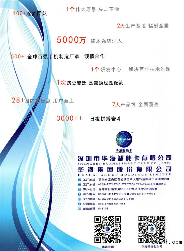 深圳市華海智能卡有限公司充分發揮地處中國深圳,毗鄰港澳的優勢,立足華南,服務全國,輻射全球。公司憑借人性化的服務、專業的技術、過硬的品質、良好的信譽、合理的價格及完善的售后服務系統,贏得了海內外廣大用戶的信賴與支持。截至目前,公司已經累計為國內外用戶提供了數十億枚的PVC、RFID產品,并廣泛應用在安防、交通、旅游、防偽、金融等各個領域,并成功進駐美國、日本、柬埔寨、馬來西亞、新加坡、俄羅斯、烏克蘭、德國、法國、英國、斯洛伐克、喀麥隆、科摩羅、吉布、也門、伊拉克、南非等100多個國家和地區。公司與世界各大半導體公司如NXP founded by Philips、EM、TI、ST、Impinj、ATMEL、法國INSIDE、英國JEWEL、以及國內的復旦微電子、華虹集成電路等廠商建立了重要合作伙伴關系。在國內外知名項目如:湖南省醫保卡、國家電網的智能標簽、地鐵(輕軌)、大型城市一卡通、mcdonalds(麥當勞)的積分系統、華為、美國T-Mobile、奧迪汽車、中國煙草、可口可樂、圖書館領域有著成功的應用案例,為RFID產業在全球的發展中發揮了積極作用。