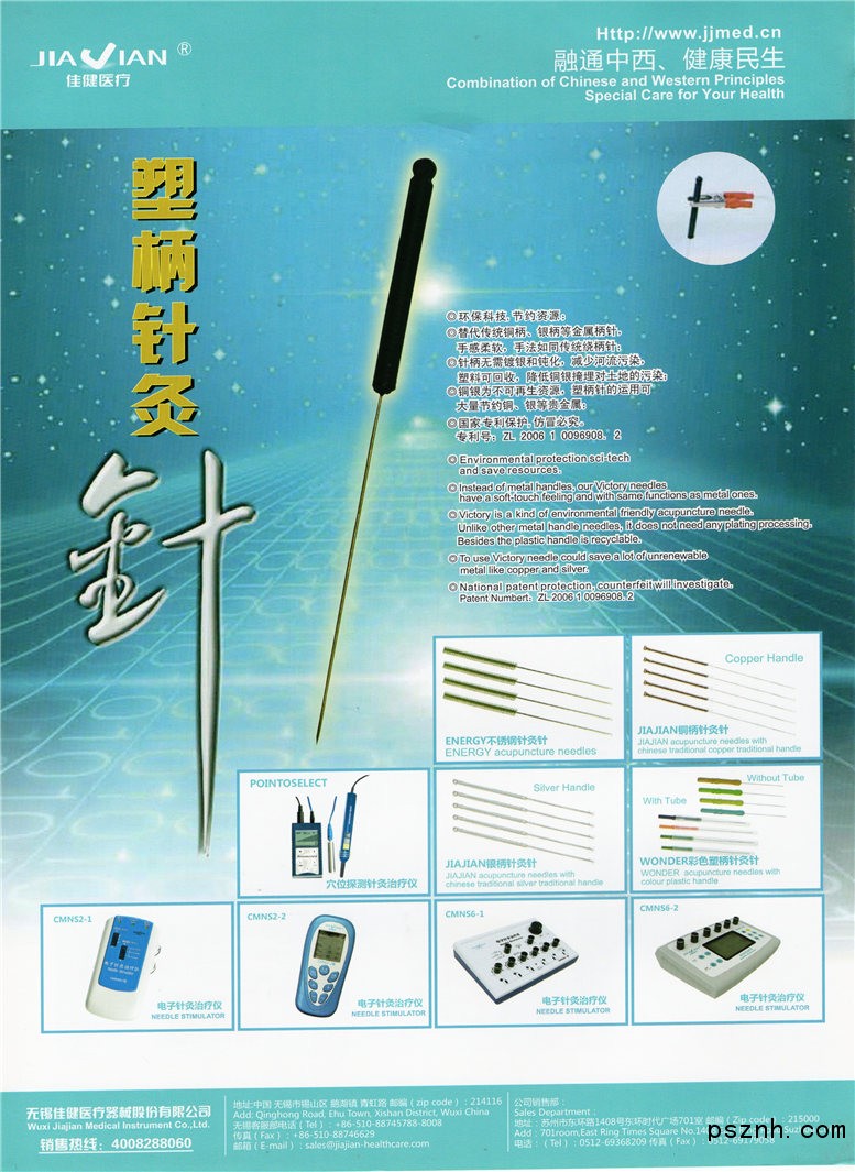 公司地處中國長三角地區(qū),位于江蘇省無錫市,占地10000多平方米,擁有廠房建筑面積20000多平方米。公司已通過ISO13485和ISO9001國際質(zhì)量體系認(rèn)證,并率先在行業(yè)內(nèi)通過了GMP審核。擁有國家發(fā)明專利,實用新型專利以及外觀設(shè)計專利等共計30多項。公司產(chǎn)品針灸針,電子針灸治療儀,導(dǎo)電塑柄針灸針,穴位探測治療儀均被國家中醫(yī)藥管理局列為國家中醫(yī)推薦產(chǎn)品,尤其是導(dǎo)電塑柄針灸針還被列為國家中醫(yī)院標(biāo)準(zhǔn)配置目錄產(chǎn)品。公司主要產(chǎn)品針灸針、電子針灸治療儀、電極片等均獲得了歐盟CE認(rèn)證、美國FDA認(rèn)證以及加拿大CMDCAS認(rèn)證。