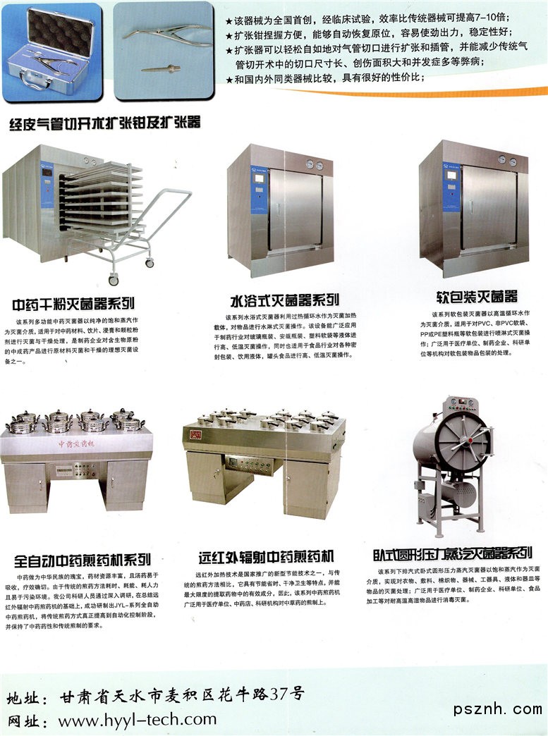 "劍齒象"牌系列消毒滅菌設備連續多年榮獲國家《中國知名滅菌器十佳品牌》,2009年"劍齒象",被甘肅省評為著名商標。"金銀花"牌遠紅外輻射中藥煎藥機獲國家科技進步二等獎并遠銷東南亞地區,深受用戶青睞。