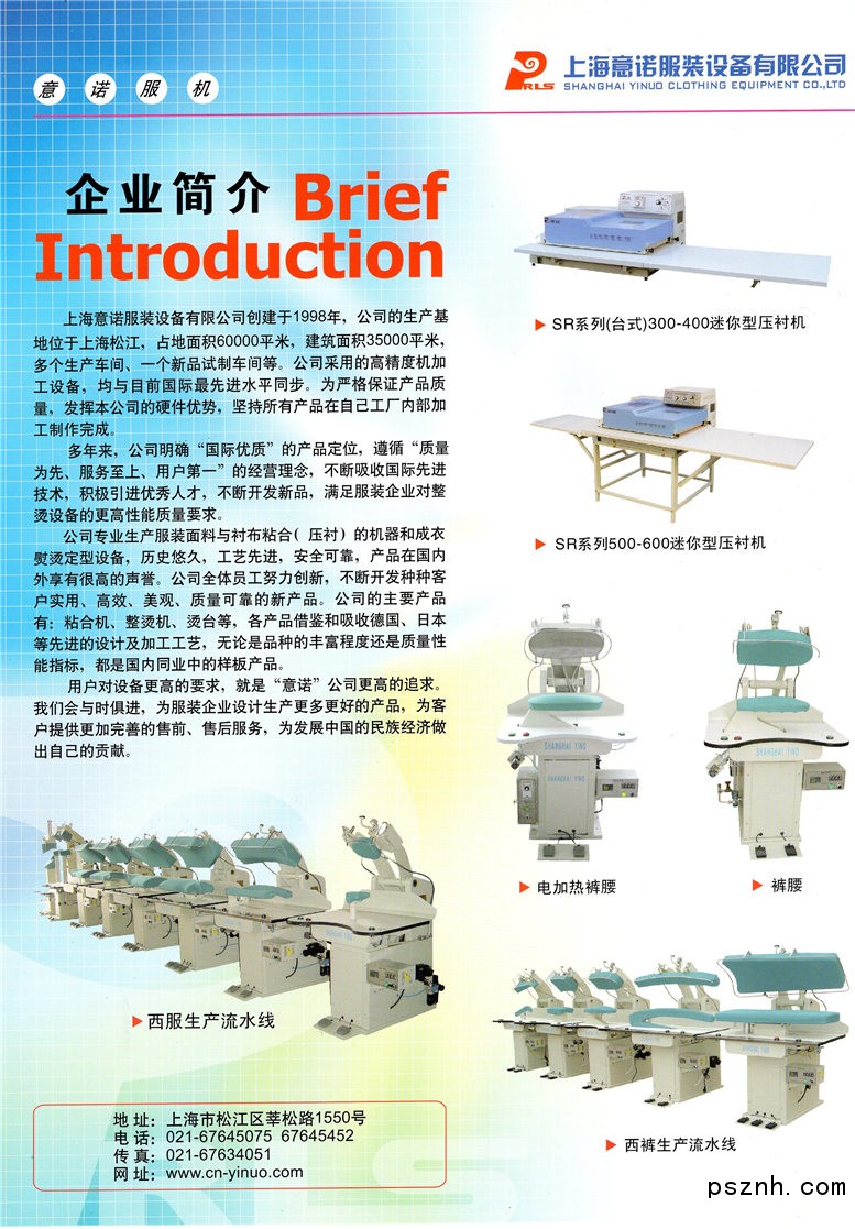 公司的主要產品共有:粘合機、整燙機、燙臺等,各產品借鑒和吸收德國、日本等先進的設計及加工工藝,無論是品種的豐富程度還是質量性能指標,都是國內同業中的樣板產品。