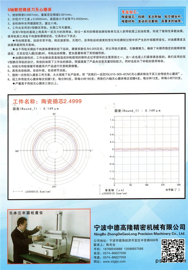主要產品有高精度無心磨床、高精度動靜壓無心磨床、納米級高精度數控微進刀無心磨床。同時可根據客戶產品需要,研發(fā)制造非標自動化磨床,達到自動上料、自動研磨、自動收料、自動檢測、自動補償、自動調節(jié),實現全自動化的目的。減少對技術人員的依賴,公司產品廣泛用于汽車、各種馬達、電機、轉軸、摩托車配件、汽車配件、家電、模具、刀具、五金、鎢鋼、傳真復印機、軸承、陶瓷插芯光纖通訊、國營軍工、航空、航海等精密制造行業(yè)。我公司生產的納米級數控微進刀無心磨床,目前在國內是頂尖的,陶瓷插芯我們能做到0.0002mm的真圓度,進刀0.0001mm進給量,外徑工差0.0005以內的精度,目前國內的磨床沒有一家能做到,就連國外的磨床也很難達到。