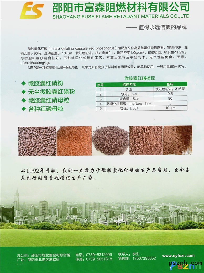 邵陽(yáng)市富森阻燃材料有限公司誕生于大學(xué)校園,壯大于湖南邵陽(yáng)工業(yè)園區(qū),1991年湘潭大學(xué)微膠囊阻燃劑經(jīng)市科委鑒定,1992年工業(yè)化微膠囊阻燃劑優(yōu)選在國(guó)內(nèi)市場(chǎng)面世,1994年創(chuàng)辦邵陽(yáng)市富森阻燃材料有限公司(前身市阻燃材料廠),專(zhuān)業(yè)研究生產(chǎn)紅阻燃劑。目前本公司有二處大型生產(chǎn)基地,能生產(chǎn)阻燃劑、細(xì)度能達(dá)5um以內(nèi),密度1以上,易加工,性能安全可靠,94年已大規(guī)模應(yīng)用于無(wú)鹵電纜料。阻燃母粒系列幾乎能滿足和行需要。二十五年來(lái),我們一直致力于阻燃劑的生產(chǎn)與應(yīng)用。