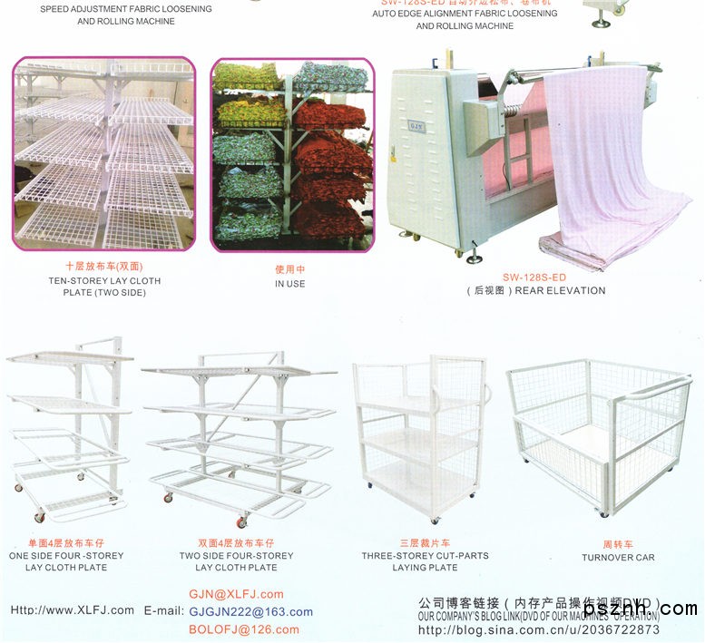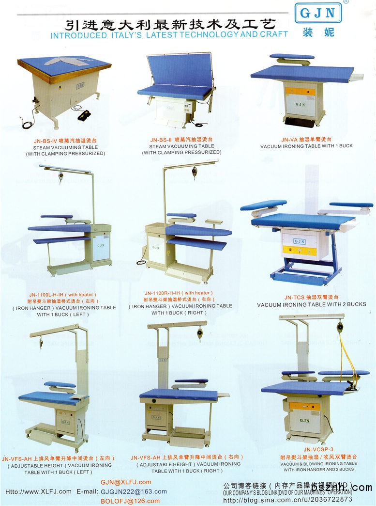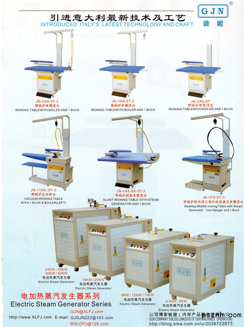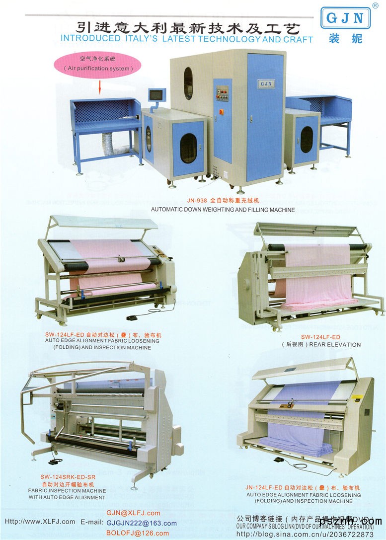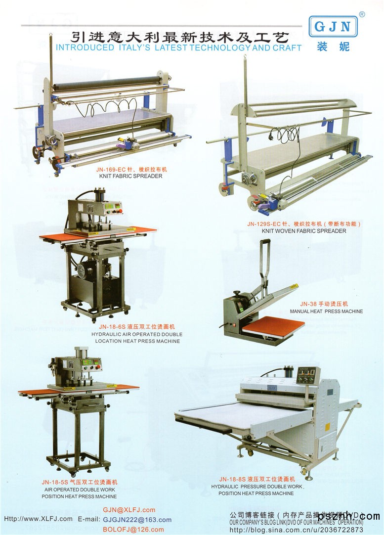 公司現生產的主要產品有:驗布機、面料預縮定型機、拉布機、自動齊邊無張力卷布機、自動齊邊松布機、切捆條機、縱直紋卷布機、自動對折縫合劈縫機、商標轉印機、粘合機、自動稱重充絨機、真空抽濕燙床、吸線頭機、吸塵掃毛機、反褲機、抽/吹風燙臺、電蒸汽燙鬥、檢針機、多功能量帶機、蒸汽夾機、襯衫機、靜電消除裝置等等。