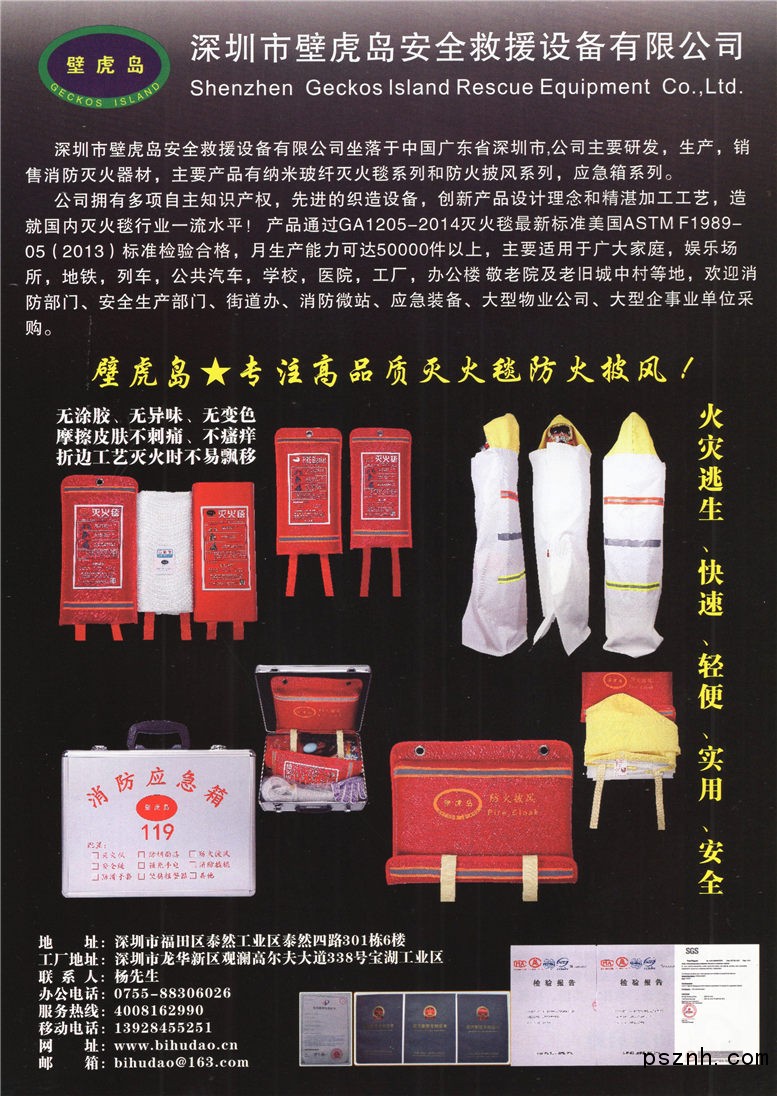 公司以“防災救災應急逃生系列”為主題,專業研制和銷售家用安全應急逃生系列、車載安全應急逃生系列,公共場所安全應急逃生系列產品, 其中主打產品火滅火毯及防火披風經國家消防裝備質量監督檢驗中心檢測合格,是全國為數不多拿到國家權威認證的企業!我們以國家標準為起點,嚴控質量,本著人無我有,人有我精的研發精神不斷創新! 目前已申請和授權了7項專利,特別是防火披風 的研發上市,為我國火災逃生防護用品市場添磚加瓦,讓原始落后跟不上社會發展的濕棉被逃生成為歷史!不久的將來有望和防煙面具組合成為公共場所和家庭火災逃生的絕配逃生用品,在火災中防煙面具可以防止吸入有毒煙氣,防火披風可以保護使用者不會直接被火焰引燃衣服和身體,大大提高了使用者的成功機會!本公司以”專業“專注“專一”為精神,致力成為安全救援與應急逃生品牌的領航者!