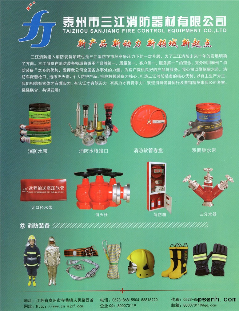 我公司成立于2003年,現擁有四個現代化的生產廠區,占地面積達二百余畝,擁有海星分公司、三江五湖貿易有限公司、江蘇三江消防工程公司、揚州江雨消防等多個子公司,累計注冊資本達叁仟萬元,專業生產消防水帶、水槍接扣、泡沫藥劑、滅火器、消防栓箱,提供消防工程的設計和施工服務,年產值過億元,是一家專業生產消防器材超大型企業。
