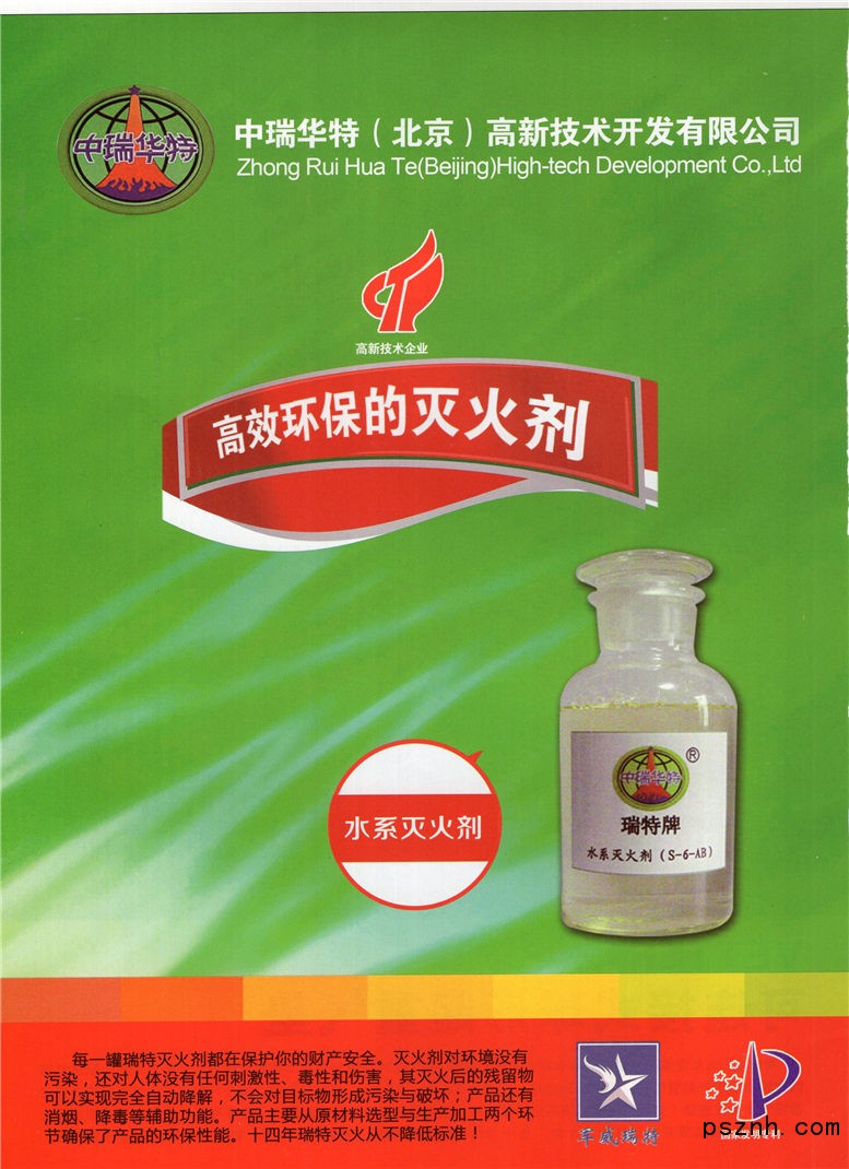 中瑞華特(北京)高新技術開發有限公司系從事液態環保水系滅火劑和消防裝備研發、生產與銷售為一體的專業公司,公司研發隊伍主要由消防專家、化工研究院生化專家和中高級技術專業人員組成,是現代管理方式與高新技術緊密結合的現代新型企業,現為中國消防協會會員單位,住建部防災救災中心付主任單位。為發展我國發展環保型、高性能滅火劑,我公司自主研發專利產品“水系滅火劑”代表了我國滅火劑的發展方向,目前在國內外屬于領先水平,也是我國目前最大年產十萬噸的生產廠家。