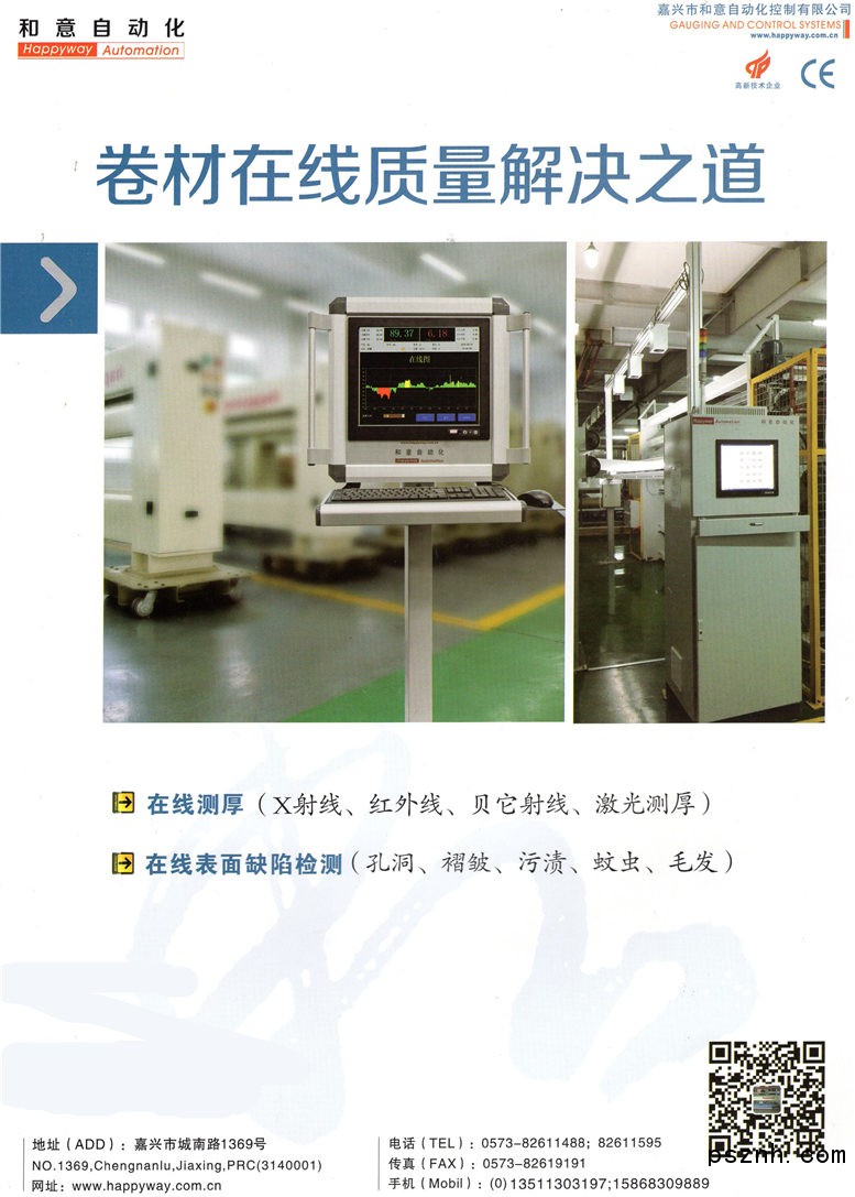 公司主要致力于塑膠、涂布、無紡布、造紙等行業的自動化,不斷提供在線質量檢測的整體解決方案,主要產品分為在線測厚和缺陷檢測兩大系列。公司自成立至今,已有逾千套產品應用于海內外。公司連續多次被認定為國家級高新技術企業,順利通過歐盟CE產品認證, 并擁有"和意® "、"happyway®"等馳名國內外的注冊商標。