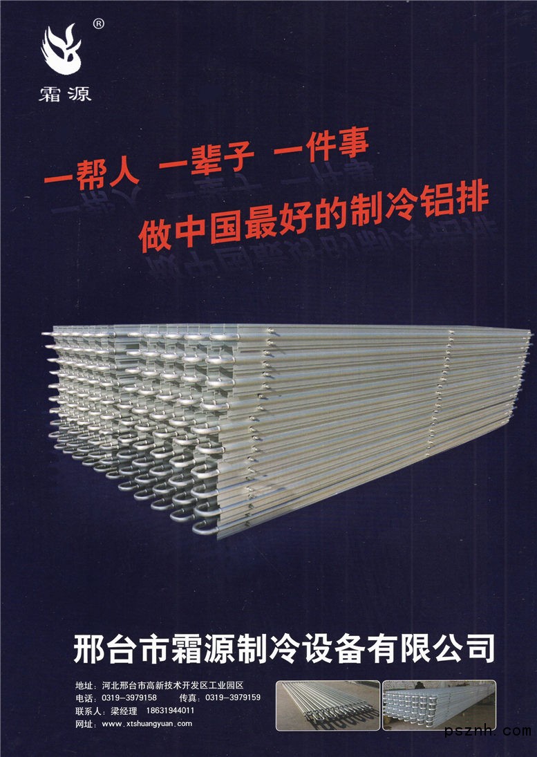河北邢臺霜源制冷設備有限公司是生產(霜源牌)系列鋁合金蒸發器(鋁排)的專業廠家 。公司主要業務為:制冷工程的設計與安裝,非標制冷設備的設計,以及冷庫鋁合金蒸發器的研發與生產,產品主要適用于各種裝配式冷庫(速凍庫,冷凍庫,保鮮冷藏庫),產品高效,省電,不占空間,系統干凈,延長壓縮機使用壽命節省冷媒,安裝方便,省時,省力,省空間的特點深受制冷公司和廣大客戶的青睞。其生產的“霜源”牌鋁合金蒸發器為全國知名品牌,在國內制冷行業中深受同仁的厚愛,其銷售范圍與銷量每年都大幅度的提升。