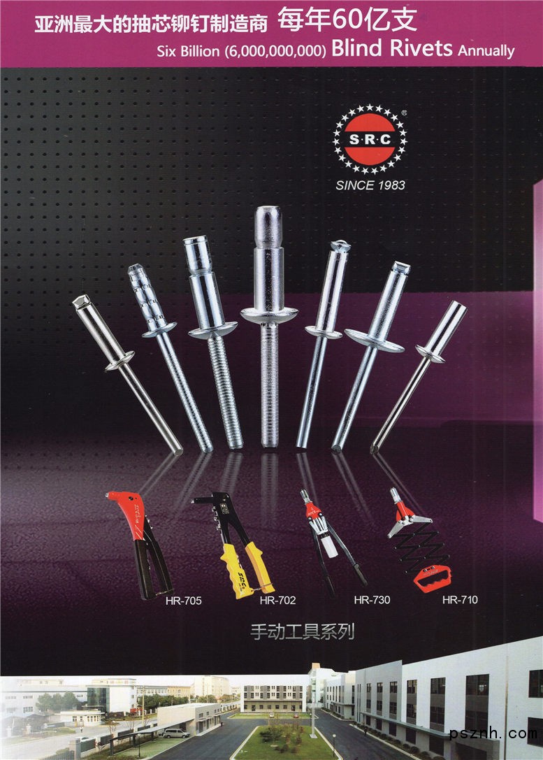 無(wú)論是源于我們SRC生產(chǎn)線還是OEM,我們都有能力處理各種大量的訂單。同時(shí)我們還供應(yīng)種類(lèi)繁多的鉚釘工具。SRC產(chǎn)品在我們的顧客群中擁有良好的信譽(yù)。公司的宗旨就是:用穩(wěn)定的質(zhì)量,競(jìng)爭(zhēng)的價(jià)格和按時(shí)交貨來(lái)令每一個(gè)客戶滿意。您的支持就是我們成長(zhǎng)中所必須的養(yǎng)料,我們熱切地希望您在SRC能夠找到您所需要的一切!