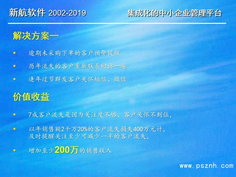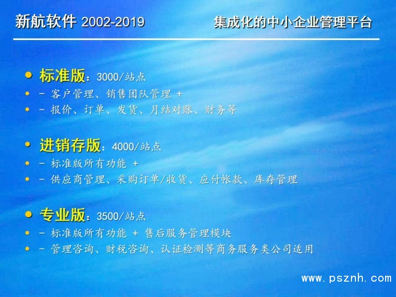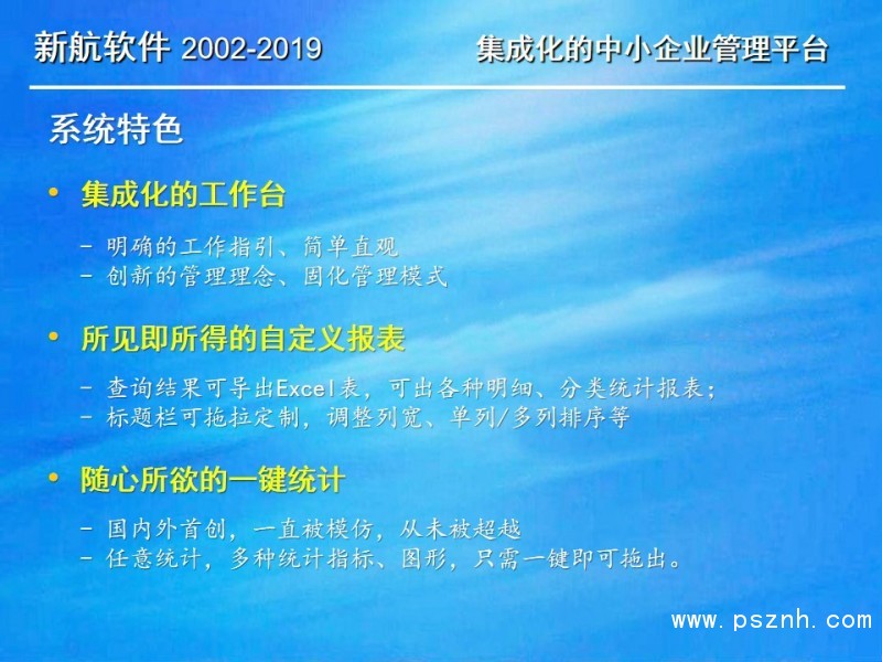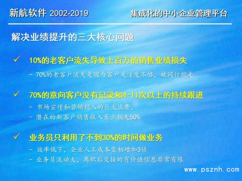 與其它管理軟件相比,新航企業信息化管理系統軟件更關注中小企業在管人、管財、管物幾個方面存在的典型問題和需求。以此為導向,新航系統提供簡單、有效、全面的信息化解決方案;新航系統內凝聚了很多實用的營銷管理理念,可以幫助企業短期內規范管理,快速建立一整套銷售部門自動化運作的管理模式。