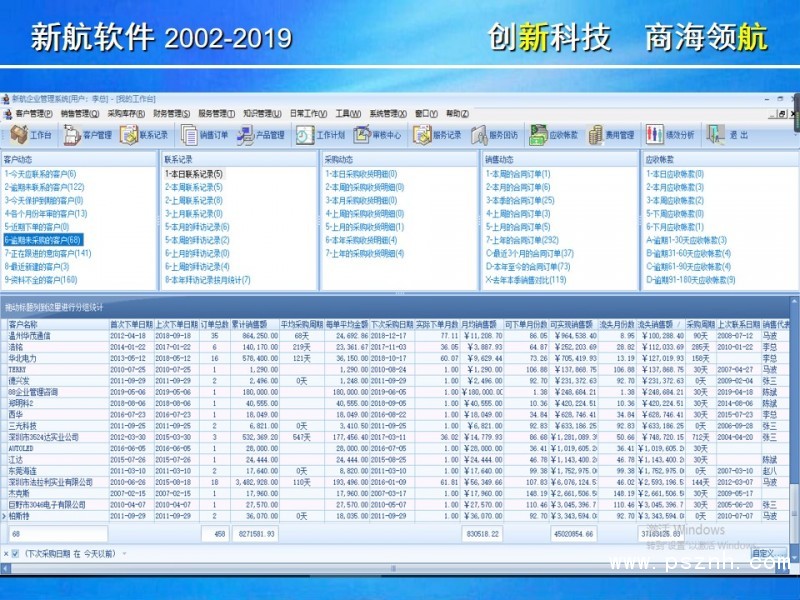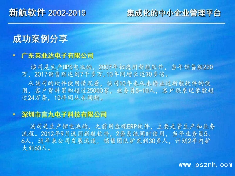 新航客戶遍布電子、IT、安防、化工、設備制造、工業控制、儀器儀表、醫療器械、醫藥、廣告傳媒、管理及投資咨詢、紡織服裝、印刷造紙、五金塑膠、家具制造、節能環保、食品飲料、商務服務等數十個領域的領先企業,基于新航系統的傻瓜易用性和一整套可定制并適應不同行業不同企業的管理模式,以及新航系統隨心所欲的強大的統計分析功能,新航系統的實施成功率非常高。在中小企業信息化管理上,新航公司有著非常豐富的實施經驗和良好的客戶口碑,新航企業信息化管理系統軟件在業內享有極高的品牌知名度。