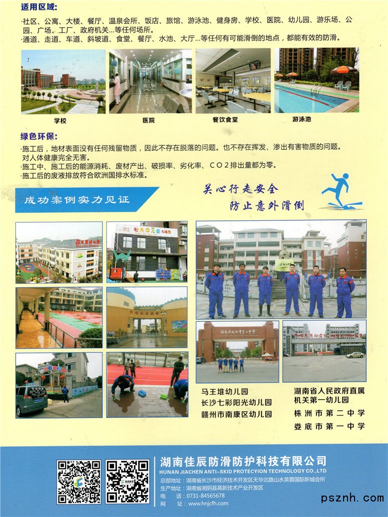 公司以長(zhǎng)沙為中心,業(yè)務(wù)覆蓋全國(guó),目前在華南、華東、華北、華中、西南、西北等地均設(shè)有辦事處。在以往歷程中,公司承蒙社會(huì)各界人士的支持與厚愛,圓滿完成了眾多經(jīng)典的地面防滑施工項(xiàng)目。諸如:學(xué)校、部隊(duì)、軌道交通、政府辦公樓、監(jiān)獄、醫(yī)院、酒店、餐廳、公共場(chǎng)所及各類大型工業(yè)廠區(qū)等,深受社會(huì)各界人士的認(rèn)可與好評(píng)。