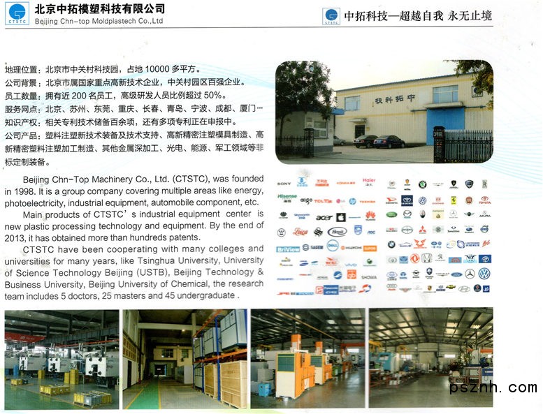 北京中拓機(jī)械有限責(zé)任公司位于北京市中關(guān)村科技園昌平園區(qū),是經(jīng)北京市科委認(rèn)證批準(zhǔn)的高新技術(shù)企業(yè)。公司占地10000多平方米。擁有近200名員工,下設(shè)開發(fā)部、技術(shù)工藝部、制造部、品控部、塑料研究所、銷售服務(wù)中心等多個職能部門,數(shù)十臺現(xiàn)代化加工及檢測設(shè)備。主要產(chǎn)品涉及: 氣輔注塑設(shè)備;精密模具制造;隔膜式高壓無油壓縮機(jī)、高低壓氮氣發(fā)生器;熱變溫?zé)o痕注塑成型設(shè)備;微孔發(fā)泡成型技術(shù)設(shè)備:工業(yè)自動化;超高亮度LED 生產(chǎn)和檢測設(shè)備等等。