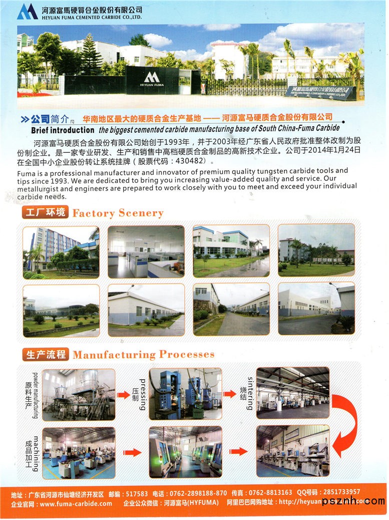 公司位于廣東省河源市仙塘經濟開發區,屬于國家級高新技術企業、廣東省創新型企業、廣東省戰略性新興產業骨干企業廣東省知識產權優勢企業,是國內專業化的超小超薄硬 質合金制品及其深加工制品生產廠家,建立有廣東工業大學河源富馬硬質合金股份有限公司博士后創新實踐基地、廣東省級企業技術中心、廣東省硬質合金工程技術研究開發中心和廣東省教育部產學研結合示范基地"切削難加工金屬材料專用刀具工程研究院"等高標準研發平臺,通過了ISO9001國際質量體系、ISO14001環境 體系認證和廣東省清潔生產審核,"富馬硬質合金"圖形商標被認定為廣東省著名商標,"富馬硬質合金"產品被評為廣東省名牌產品。