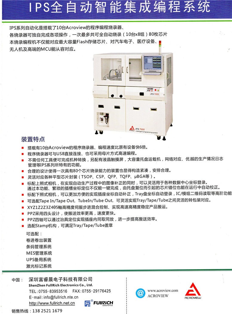 深圳富睿晨電子科技有限公司是IC編程及測試服務公司并為生產工廠提供半導體自動化解決方案。在FullRich,提供產品技術及生產支持服務,為客戶重點提供符合成本效益的IC編程、測試及自動化解決方案(包括小批量、大批量及外包服務)。在中國半導體高速發展的今天,FullRich有著顯著的增長,針對半導體工廠、芯片通路商、手機制造商、汽車電子、消費數碼電子及EMS代工廠提供半導體編程、測試的專業服務。并在華南、華東設立燒錄、測試服務中心及技術支持中心,加強本地化服務支持,以達到公司高質量、高標準、高效率的服務理念為最終目標而努力。
