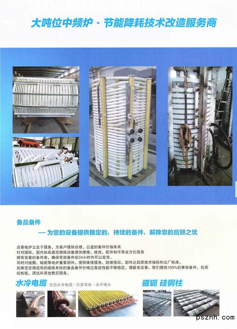 新型節能烤瓷感應圈、節能干式電抗器、油浸式電抗器、新型空心水冷電纜、磁軛(硅鋼柱)、自動液壓換爐開關、水冷爐蓋、鋁合金爐殼、不銹鋼消磁材料;高強絕緣柱、金云母板、四氟板、電纜無碳橡膠管、KK\KP、電力電容器;中頻爐耐火磚、耐高溫澆注制式塊、高分子石棉板、石棉夾磚、無塵石棉布;