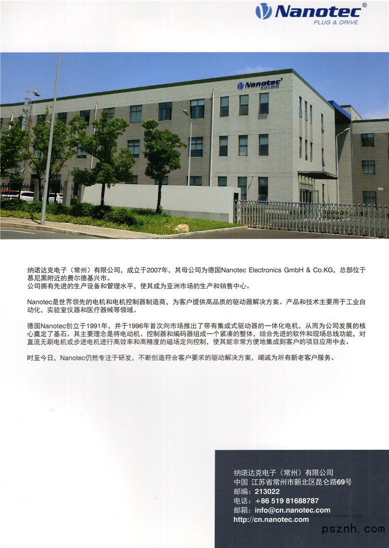 納諾達克電子(常州)有限公司作為德國Nanotec Electronic GmbH & Co. KG在中國的子公司,成立于2007年,生產制造Nanotec品牌產品,并負責整個亞洲市場的推廣和銷售。Nanotec Electronic德國成立于1991年,一直致力于向市場提供基于高性能步進電機、無刷直流電機、線性執行器及創新型電機控制器的驅動方案,并由此成為客戶可靠的合作伙伴。