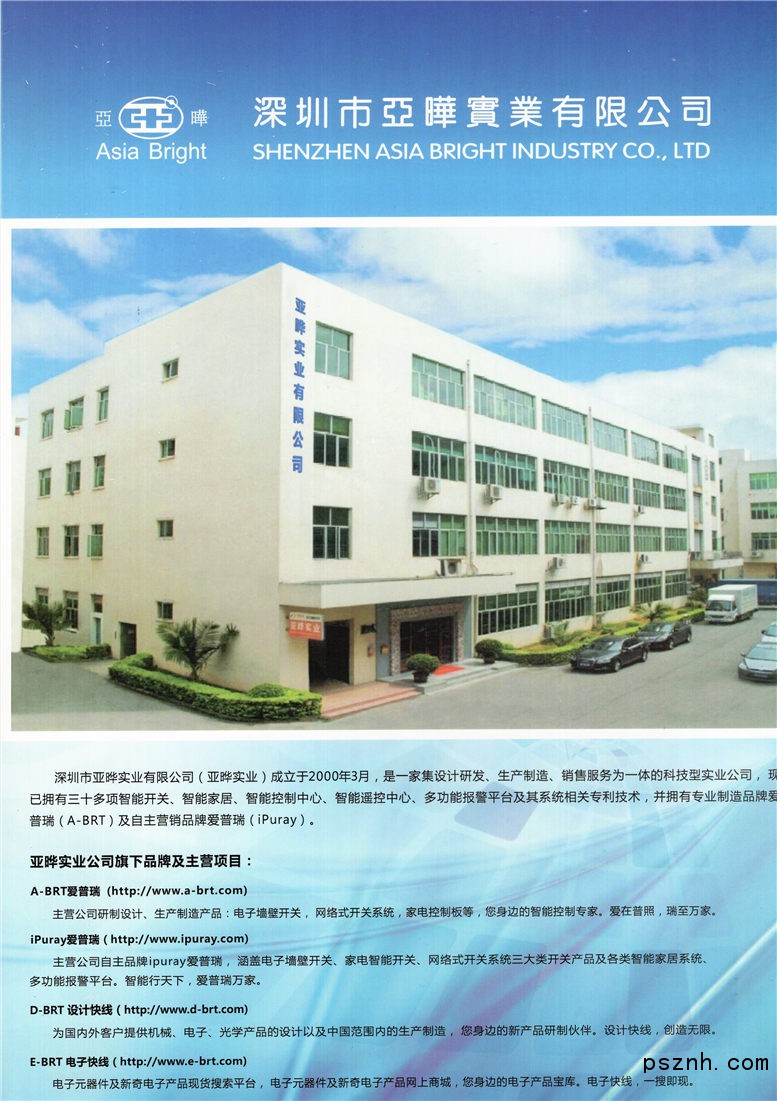 深圳市亞曄實業(yè)有限公司成立于2000年3月,是一家集設計研發(fā)、生產制造、銷售服務為一體的國家級高新技術企業(yè)?,F已擁有五十多項智能控制專利技術,并擁有專業(yè)制造品牌愛普瑞(A-BRT)及自主營銷品牌愛普瑞(iPuray)。公司研發(fā)制造三大類產品,a.控制板類:普通家電控制板、智能家電控制板;b.開關類:智能家居開關、智能家電開關;c系統(tǒng)類:智能開關系統(tǒng)、智能控制系統(tǒng)、多功能報警系統(tǒng)。涵蓋人體感應、調光調速、定時延時、無線遙控、聲控光控、溫控濕控、WiFi遠程控制、智能遙控中心、網絡自動控制等智能家電控制技術及智能家居控制系統(tǒng),包括LED調光、空調自動節(jié)能控制、風扇調速、吊扇/排風扇遙控等智能家電應用。產品融入智能手機、物聯網等智能家居先鋒理念,遠銷美國、歐洲、澳大利亞、中東等世界各地。