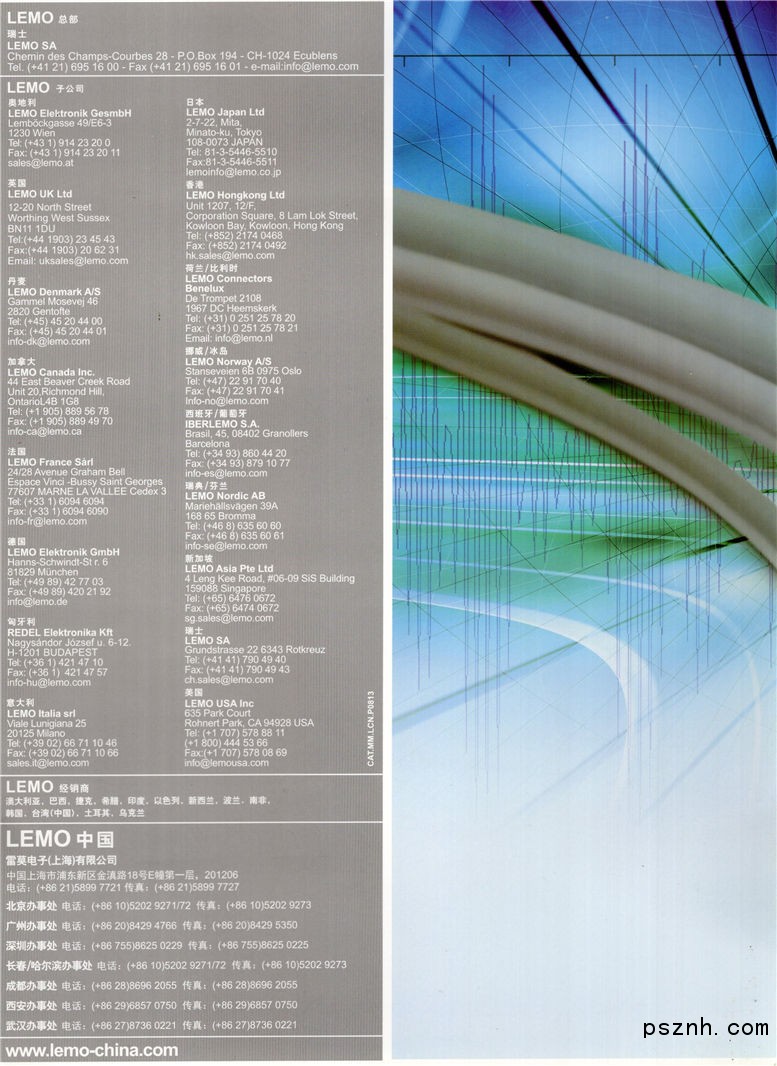 LEMO通過其遍布亞洲、歐洲、北美、中美洲及南美洲的子公司與客戶保持密切的聯(lián)系,并在其他地區(qū)建立了代理及銷售辦事處。