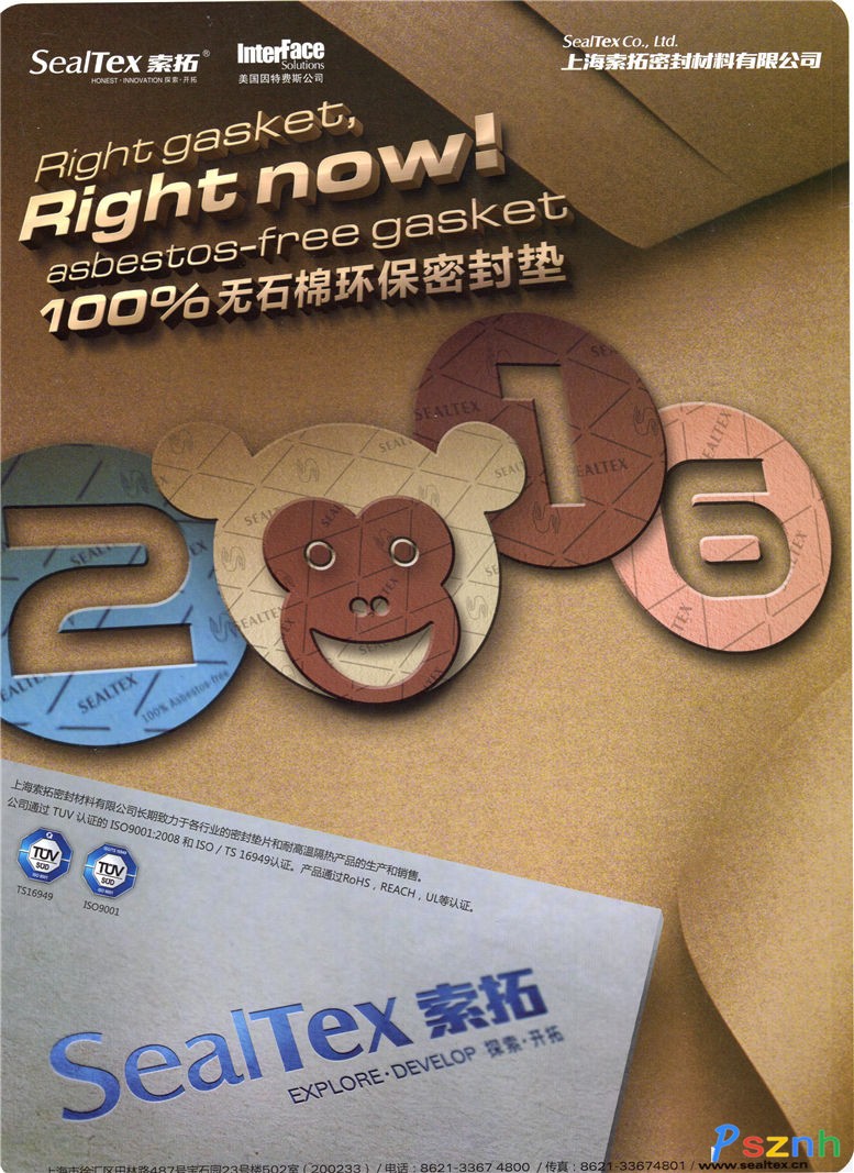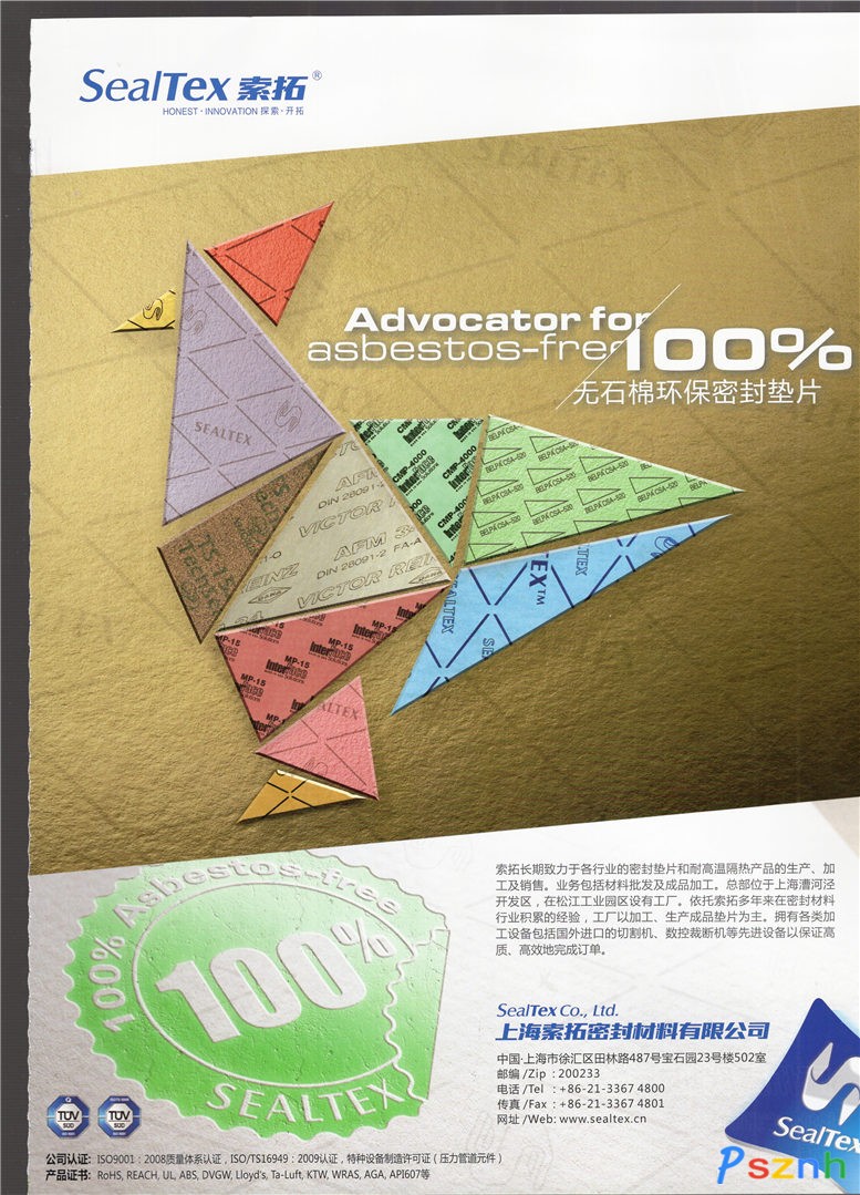 上海索拓密封材料有限公司為Interface Solutions(美國因特費斯墊片公司)、FIBRAS Y ELASTOMEROS,S.A.(西班牙標牌密封材料有限公司)的合作伙伴。長期經營各類耐高溫、耐高壓、耐酸堿無石棉環保墊片,各類高溫絕緣板、電機、電氣絕緣材料。可應用于石油、化工、冶金、汽車配套及售后、造船、電力、電機等。我們的產品很榮幸為中國的許多知名用戶所采用,如上汽通用、寶鋼集團、揚巴石化、南方電力、金光紙業等。